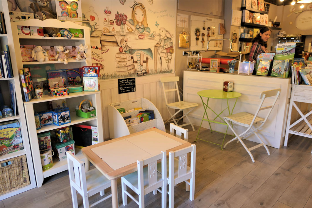 Disposa d’alguns articles de material educatiu i joguines. El marxandatge relacionat amb personatges del llibre infantil, Alícia, Peter Pan, Elmer l’elefant, el món d’Eric Carle, etc. els trobem a les lleixes de l’entrada, és un material que està tenint força èxit. La llibreria disposa d’un parell de taules, una per als nens perquè puguin mirar i llegir els llibres amb comoditat, i una altra a disposició de mares i pares perquè puguin esperar-se tot prenent un cafè.