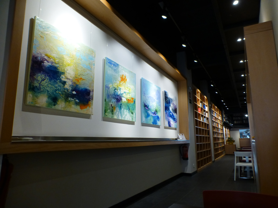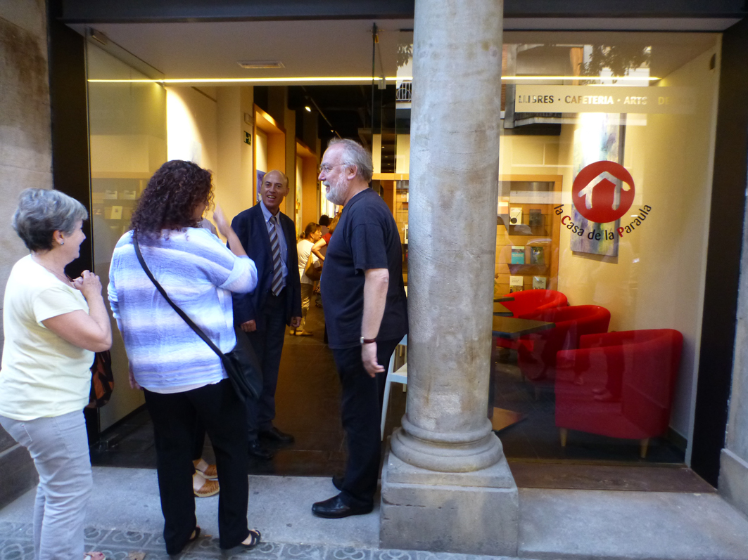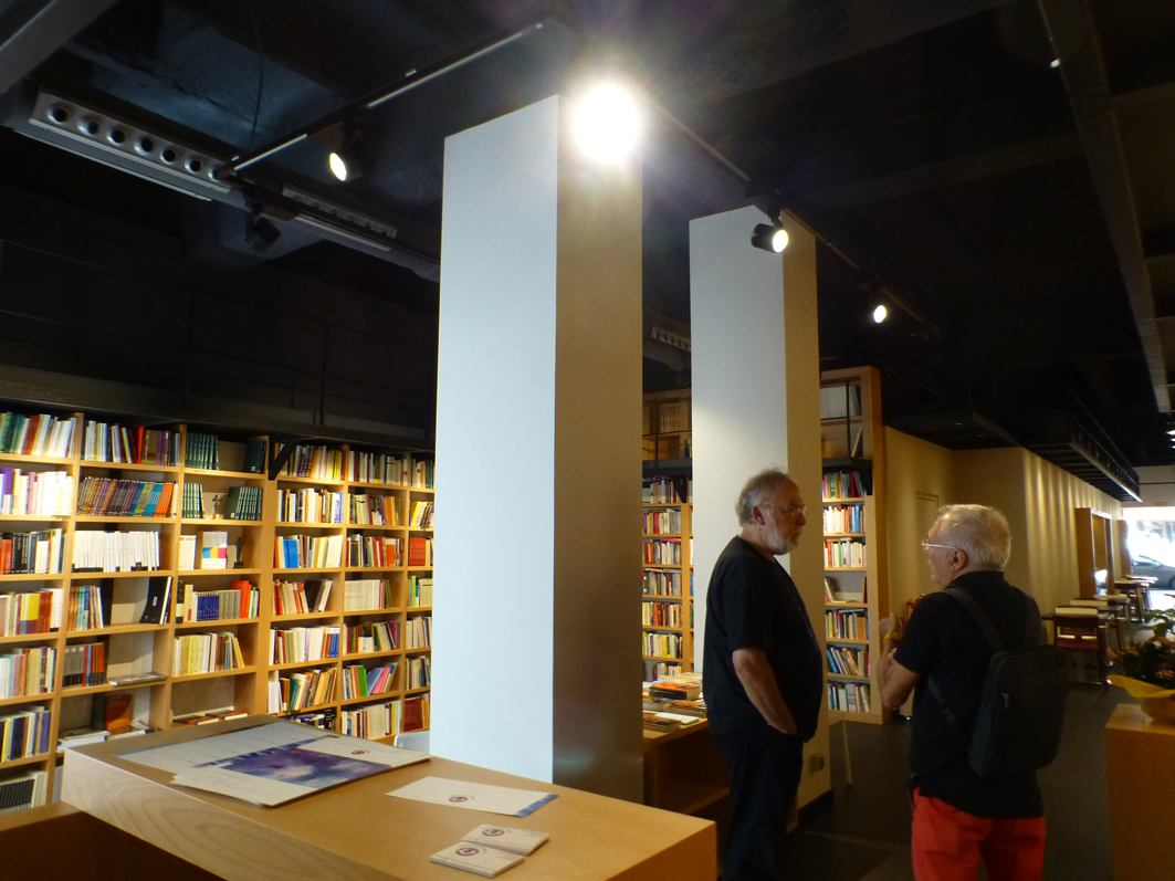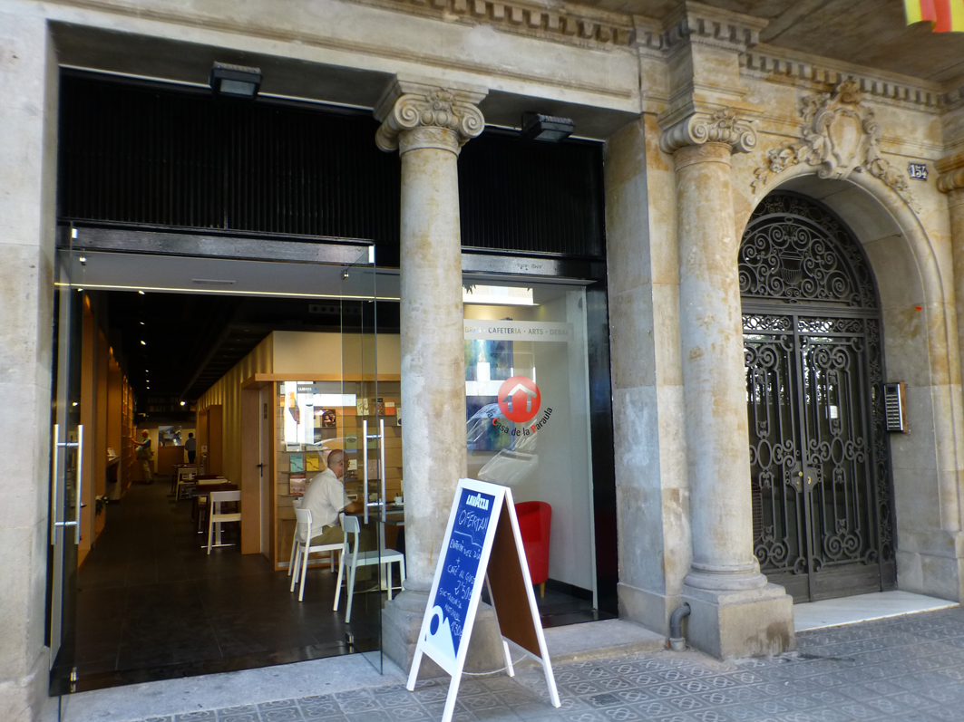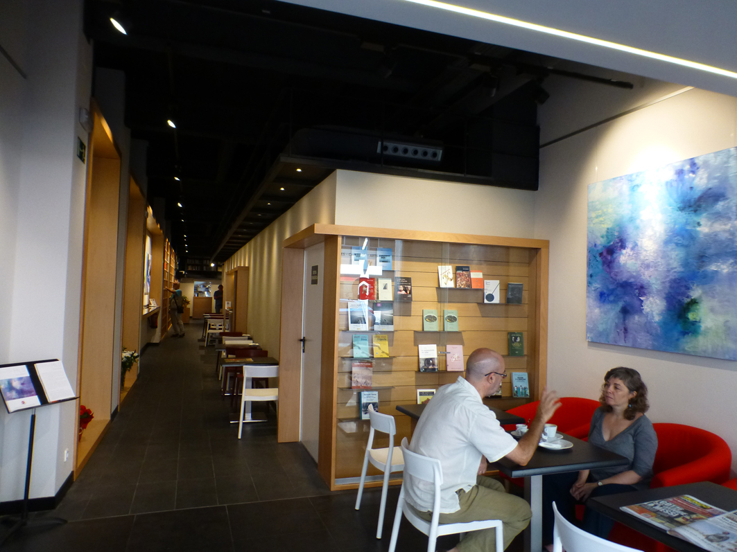 L’entrada de La Casa de la Paraula està dedicada a exposicions temporals d’obres d’art. Ara acull les pintures de l’artista francès Jean-Marc Hild sota el títol Gravitations. També en aquesta zona hi trobem taules on poder prendre un cafè o algun plat lleuger tot gaudint de bones vistes al carrer. En el moment de la visita, una parella ocupa una de les taules, està parlant animadament i no puc evitar sentir alguns noms, Lacan, Freud, Masotta… Més endavant a la dreta hi ha la barra del ben equipat servei de bar/cafeteria. Finalment a la part posterior, l’espai s’eixampla i els prestatges ocupen la totalitat de les parets de dalt a baix.