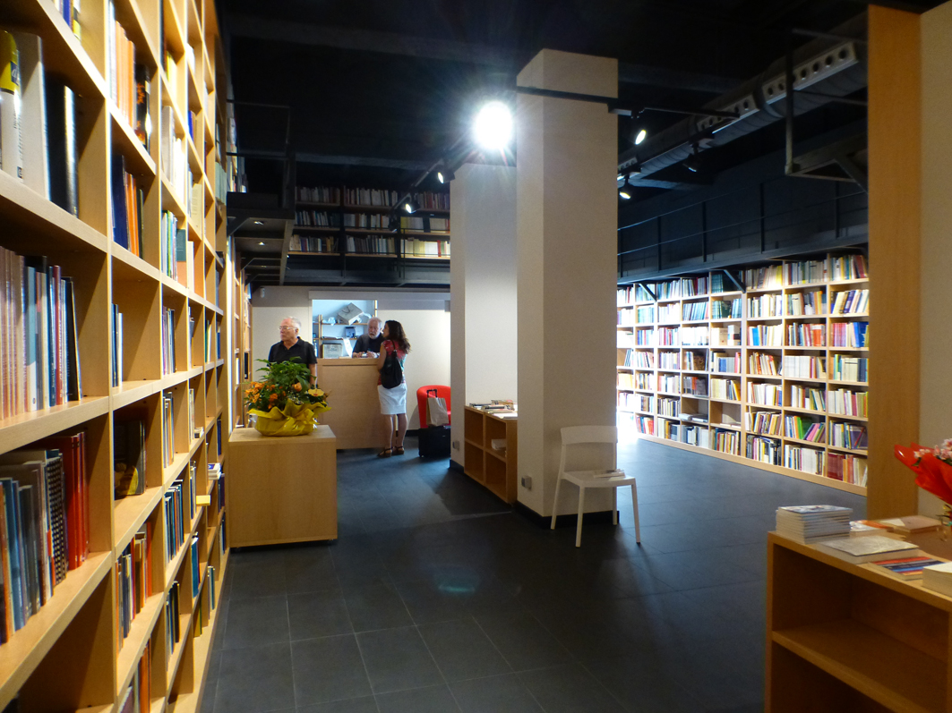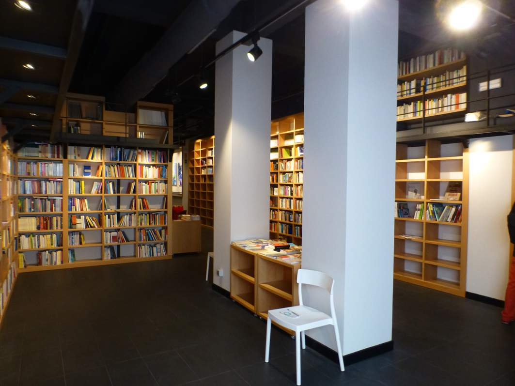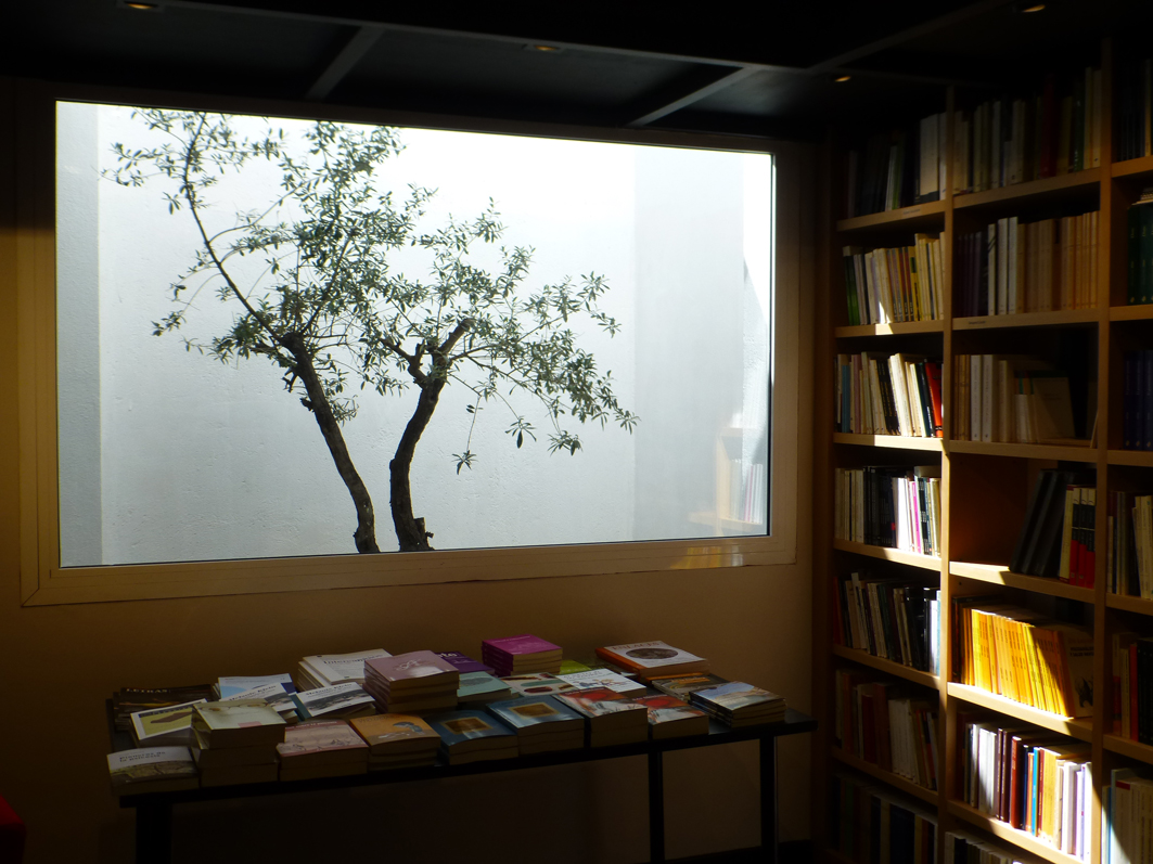 Som a la llibreria, un espai diàfan i polivalent que permet fer tota mena d’activitats, presentacions, debats, trobades, cursos, etc. A les lleixes encara queden alguns espais per omplir, poc a poc s’anirà fent. Al fons, una finestra horitzontal emmarca una olivera. La imatge, gairebé irreal, recorda i molt un gravat japonès antic. Un discret moble fa les funcions de caixa i punt d’atenció al client.