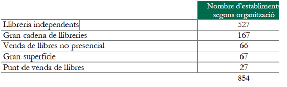 Així, observem que les fonts principals que es van fer servir per a la construcció de la base informativa censal van ser el Mapa de llibrerías [de España] de 2014[i], completada i verificada pel Gremi de Llibreters i per les dades provinents de SABI: sistema de análisis de balances ibéricos (base de dades que conté informació financera d’empreses espanyoles). El cens de partida mostra un total de 854 establiments, desglossat de la següent manera: