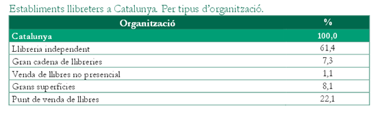 El Mapa de llibreries de Catalunya 2016 inclou cinc categories diferents pel que fa al tipus d’establiments llibreters: la llibreria independent, gran superfície, gran cadena de llibreries, comerç minorista de llibres (no presencial) que no disposa d’establiment comercial (físic) com a canal de vendes –han de tenir la seva seu física a Catalunya– i altres punts de venda de llibres. Aquesta és la seva representació: