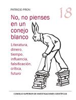 Pron, Patricio. No, no pienses en un conejo blanco: literatura, dinero, tiempo, influencia, falsificación, crítica, futuro. Madrid: Consejo Superior de Investigaciones Científicas, 2022. 90 p. (Serie 23 de abril; 18). ISBN 978-84-00-10976-9. Disponible también en línea: http://libros.csic.es/product_info.php?products_id=1601