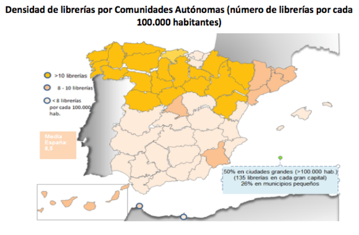 - La xifra implica una ràtio de densitat de 8,5 llibreries per cada 100.000 habitants (amb un creixement respecte de l’any anterior, però, i aquesta lectura és rellevant, inferior respecte del nivell d’abans de la crisi, any 2008).
