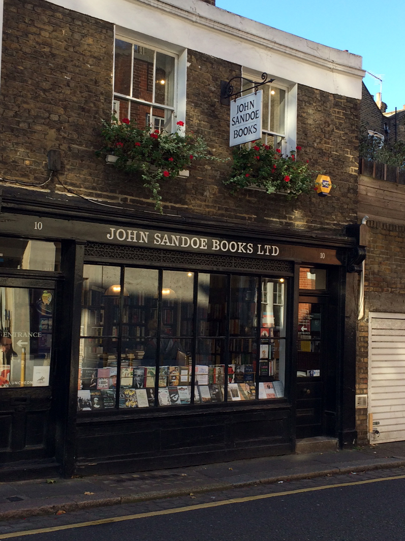 Precisament en una estada anterior a la capital britànica (quan sí que vaig visitar les llibreries esmentades anteriorment), havia passat unes quantes vegades per davant de John Sandoe Books, ubicada en un carreró que dona a King’s Road, Chelsea, però sempre a primera hora del matí o al vespre, en horari de tancament. Abans d’anar-hi aquesta vegada, tot just acabat d’aterrar, m’he assegurat que la llibreria sigui oberta. Abans d’entrar, em recreo amb l’elegant aparador, de fusta negra, coronat per la bella tipografia del rètol. Entro i deixo la maleta en un racó. Veig copes brutes en caixes i restes d’ampolles de vi, d’alguna celebració de la vigília. Regna una certa atmosfera de ressaca i em sap greu haver-me perdut la festa.