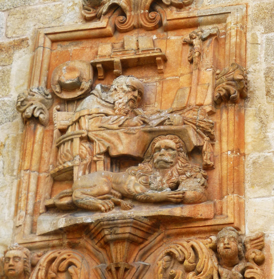 Continuant amb la tradició encetada l’any passat, presentem un nou Sant Jeroni, que com sabem se celebra el 30 de setembre i és el patró dels llibreters. Aquest bonic baix relleu es troba a la façana principal de la catedral de Mondoñedo, a Galícia. Mostra alguns dels atributs que acostumen acompanyar el sant, uns llibres a les lleixes, el lleó mans als peus, el capel de cardenal penjat, una vanitas (crani) damunt la taula i el mateix Sant Jeroni concentrat escrivint la traducció de la Bíblia. Per completar els atributs només hi falta la pedra amb la qual es colpejava el cap per no adormir-se.
