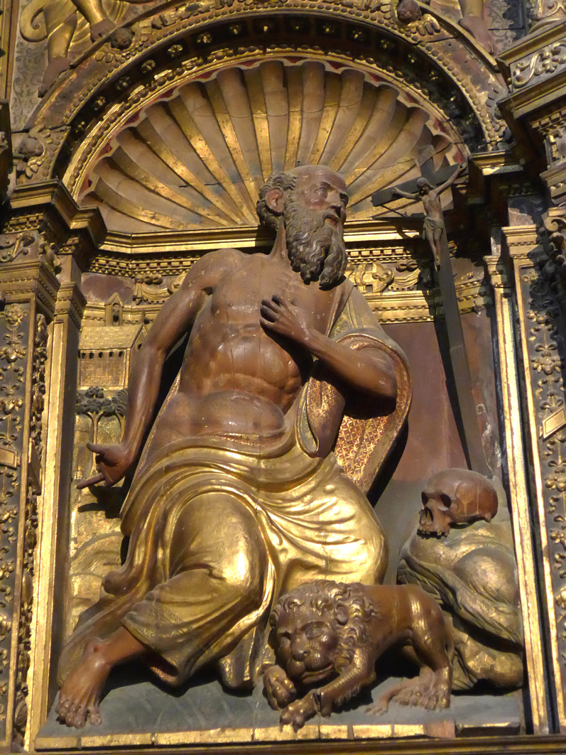 El Sant Jeroni de Jaca data aproximadament de 1573, va ser sufragat pel seu bisbe Pedro Baguer, que també ho fou de la ciutat de l’Alguer a Sardenya. En aquest retaule trobem el sant acompanyat per una vanitas sobre unes roques, un petit lleó —sí és un lleó— als seus peus i… òndia!… manca el llibre. Si es mira amb atenció la fotografia es pot observar que a la mà dreta li falten dits, possiblement aquest dits sostenien un llibre que fa temps i per raons desconegudes va desaparèixer. Aquesta tesi d’urgència és confirmada amablement per una de les guies de la catedral.