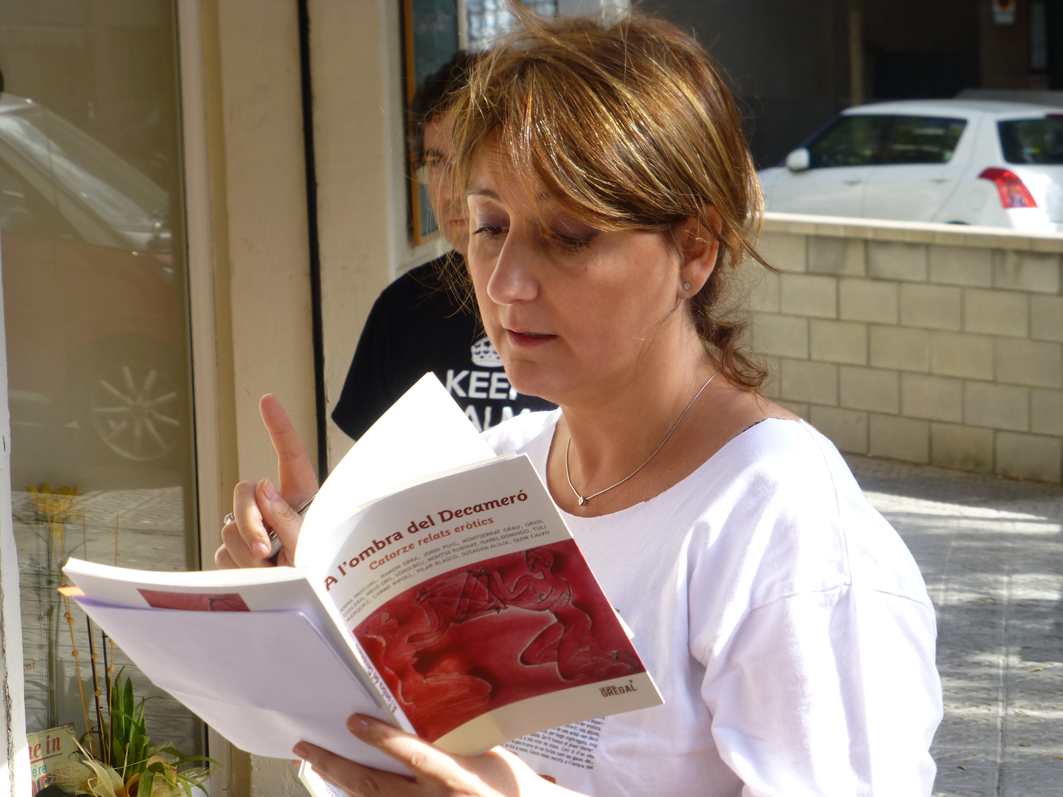 A Sopa de Lletres mensualment presenten un llibre. Ho fan al carrer, a l’espai que queda entre la botiga i la vorera improvisen un pati de butaques. El diumenge 26 d’octubre, dia que visitem la botiga, es presenta A l’ombra del Decameró, catorze relats eròtics (Gregal, 2014). Títol suggeridor que parodia Les ombres de Grey. Són les catorze històries que una colla de lletraferits escriuen durant la seva estada en una finca a prop de Barcelona, Conyserola [sic]. Són narracions per ser llegides amb una sola mà. A l’acte hi assisteix Ricard Mirabete de Gregal i alguns dels autors, els quals llegeixen diferents fragments dels relats. Finalment, i com no podia ser d’altra manera, ens conviden a croquetes de la casa i cava del país, salut!!!