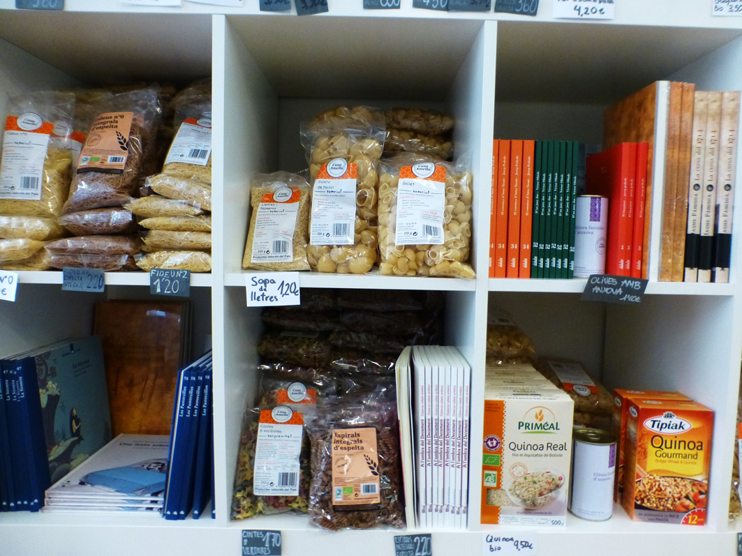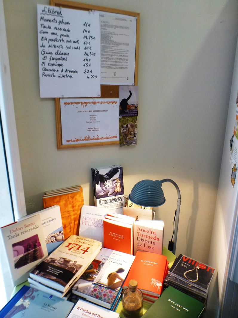 Alguns racons de la botiga, un espai acollidor i modern, són ocupats pels llibres. Entre llaunes d’escopinyes i paquets de pasta hi trobem narrativa, al costat de melmelades i confitures, poesia, més avall, al costat dels vins, gastronomia. El fons és reduït per necessitat, és format pels seus propis llibres, uns quants de poetes propers i una mica de gastronomia. Alguns clients fan donació de llibres de cuina que ja no utilitzen, així poc a poc s’està creant un fons especialitzat en gastronomia que és a disposició de tothom.