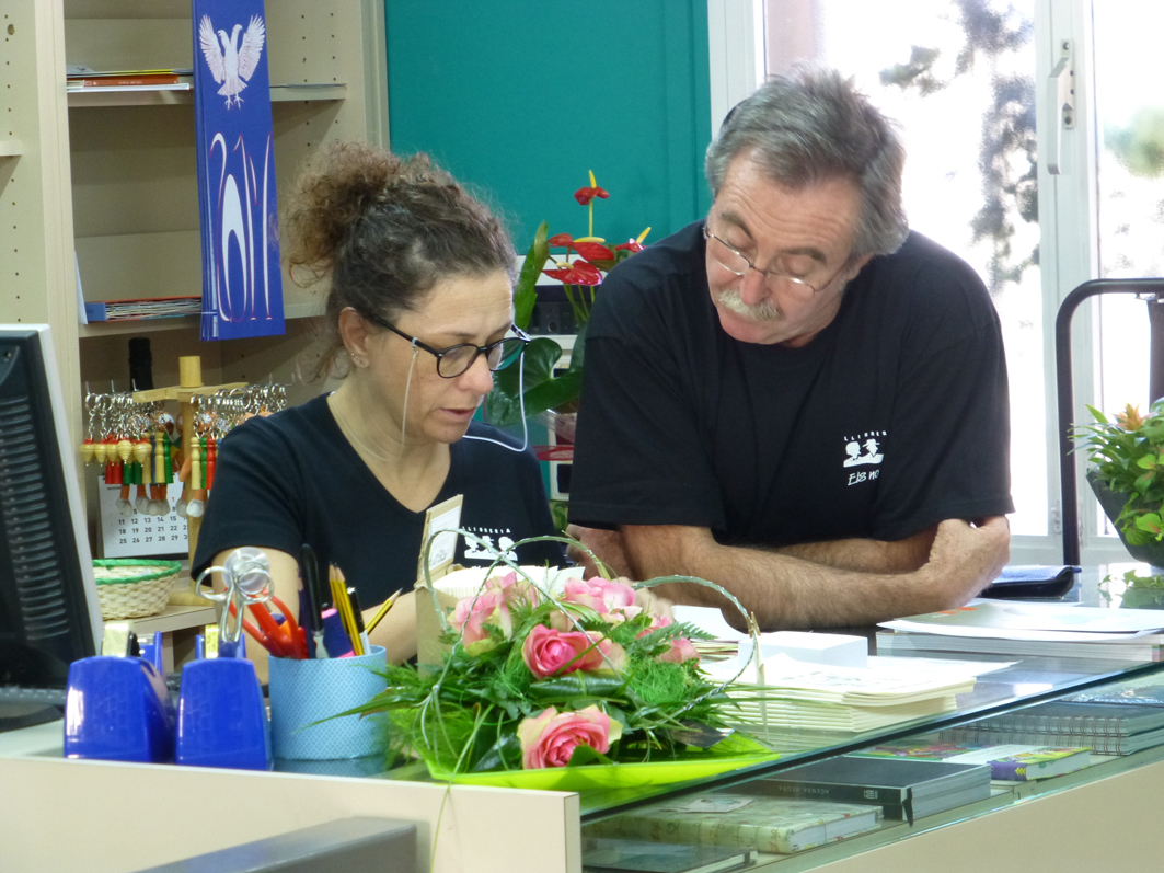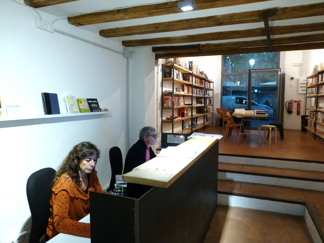 El taulell d’atenció als clients, situat al fons de la llibreria, Mireia Gispert i Xavier Cortès |