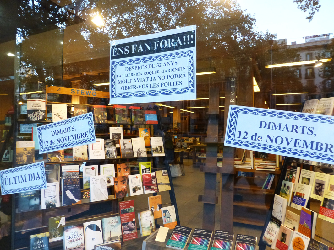 Ara a Barcelona, una mala notícia, no per coneguda menys dissortada. La Llibreria Roquer, situada als Jardinets del Passeig de Gràcia 122 ha tancat. Ja fa dies que als aparadors hi havia cartells que ho anunciaven «Ens fan fora!!! Després de 32 anys la Llibreria Roquer – Jardinets molt aviat ja no podrà obrir-vos les portes« «dimarts 12 novembre ultim dia». Sembla ser que tota la finca ha estat venuda i els nous propietaris no volen renovar el contracte de lloguer. Des d’aquest blog volem agrair la feina feta per la Llibreria Roquer,de ben segur que la trobarem a faltar.