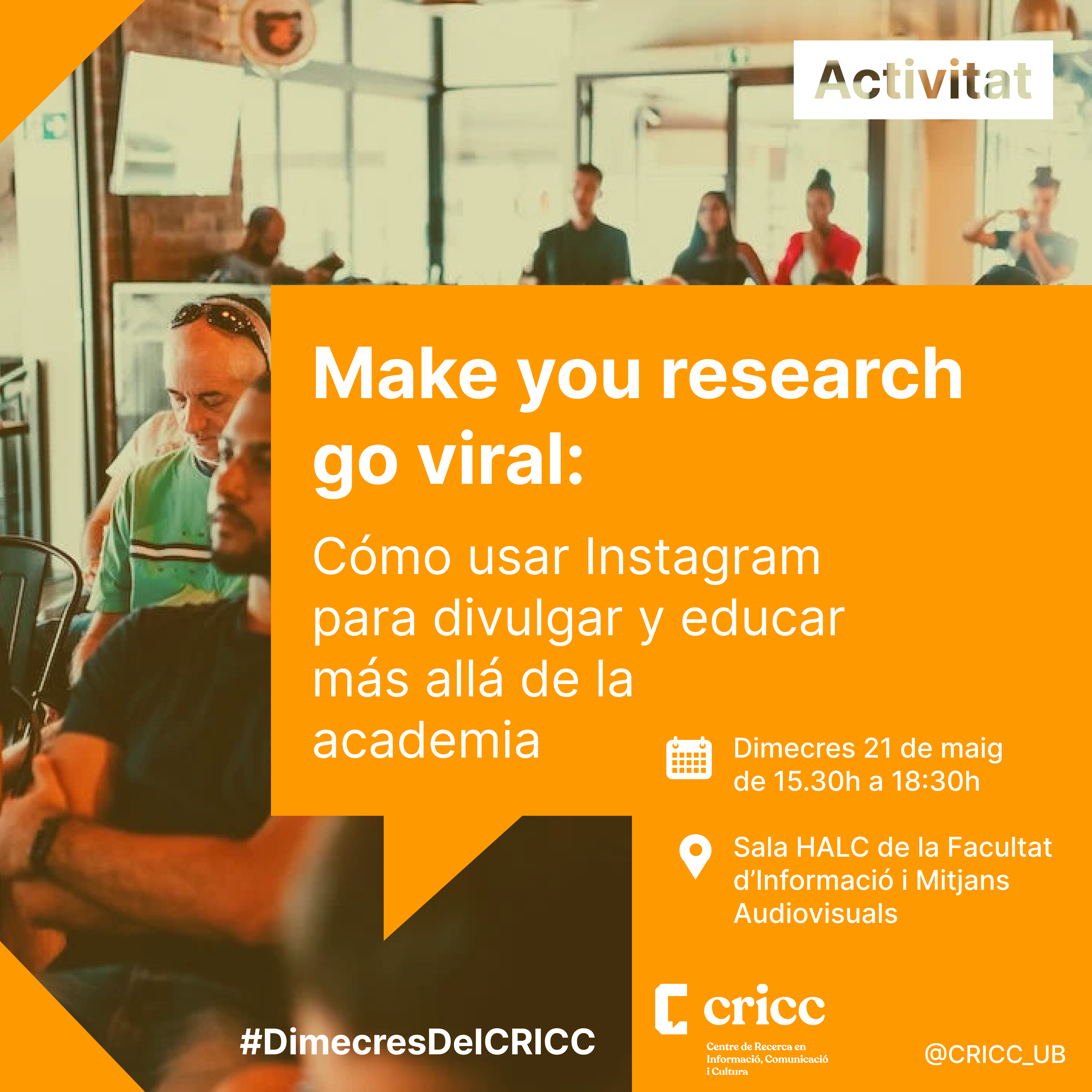 L’activitat dels DimecresDelCRICC del mes de maig serà el taller “Make your research go viral”: com utilitzar Instagram per divulgar i educar més enllà de l’Acadèmia, a càrrec de Clara Fagundes E Souza, investigadora i consultora especialitzada en divulgació acadèmica feminista que està fent una estada de recerca a la FIMA, en el si del CRICC.