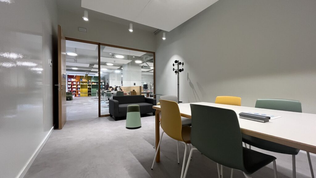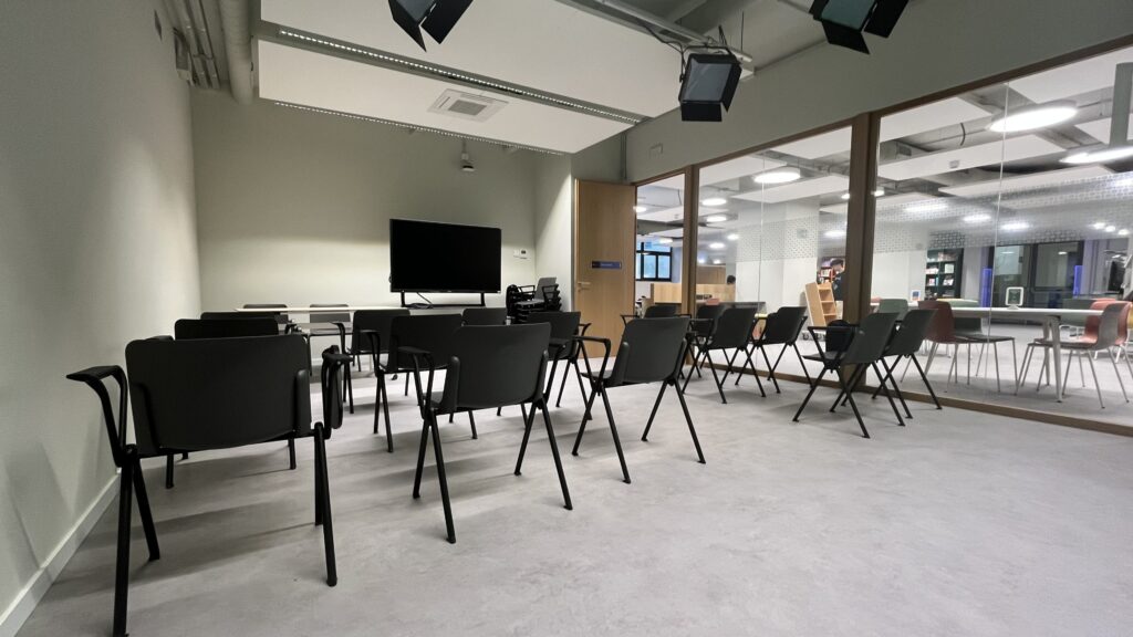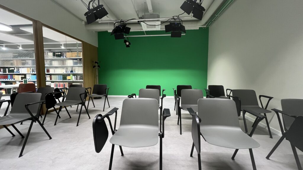 - Una sala polivalent per a grups més grans, equipada amb una paret amb croma per fer gravacions.