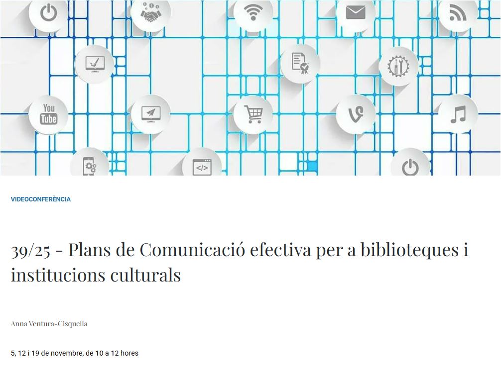 La doctoranda de la Facultat d’Informació i Mitjans Audiovisuals (FIMA) i membre del projecte CUVICOM, Anna Ventura-Cisquella, ha impartit aquest novembre de 2025 el curs «Plans de comunicació efectiva per a biblioteques i institucions culturals», organitzat pel Col·legi Oficial de Bibliotecaris-Documentalistes de Catalunya. La formació oferia eines pràctiques per planificar,…